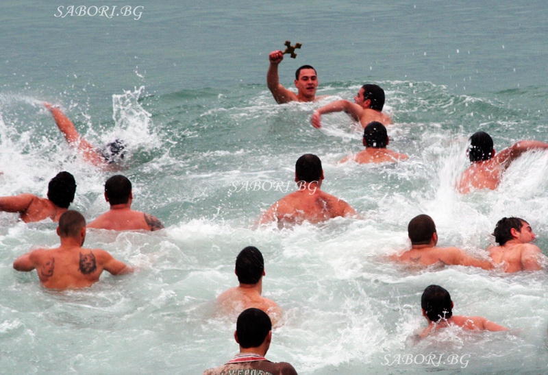 | Богоявление в гр.Приморско. Ритуалът по спасяването на Светия кръст символизира кръщаването на водата и напомня за това, че Исус Христос е бил кръстен във водите на река Йордан от Йоан Кръстител. Спазвайки традицията куражлии ще опитат да се преборят с бурните зимни води на морето и да извадят кръста. | |
